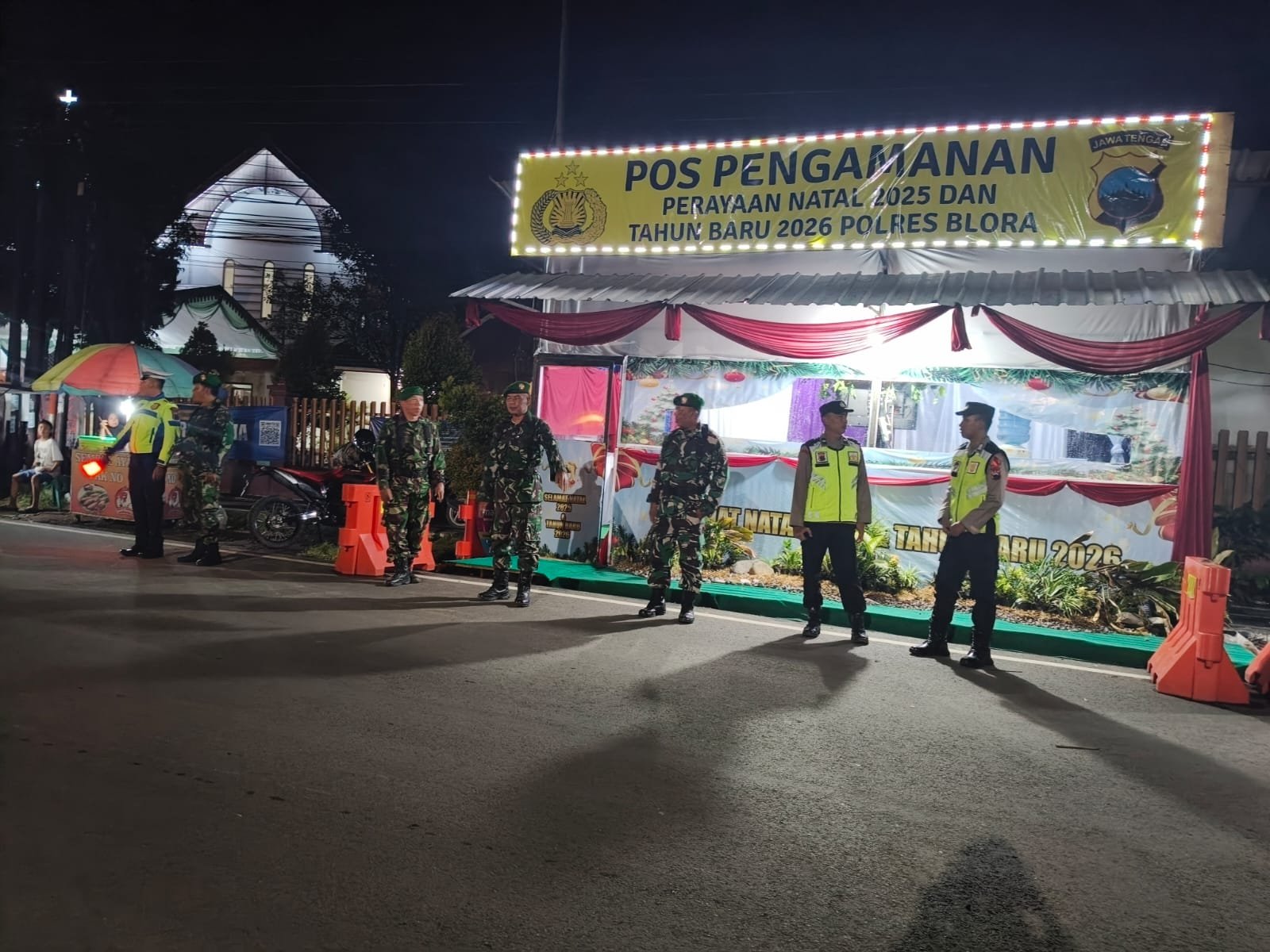 CEPU l Beritakilat.id – Menjelang puncak peringatan Natal 2025, jajaran Polres Blora terus meningkatkan intensitas pengamanan di sejumlah gereja prioritas. Personel yang tergabung dalam Pos Pam Gereja Willibrordus Cepu melakukan pemantauan ketat serta pengaturan arus lalu lintas guna memastikan situasi kamtibmas tetap terkendali, Selasa (23/12/2025) malam.
