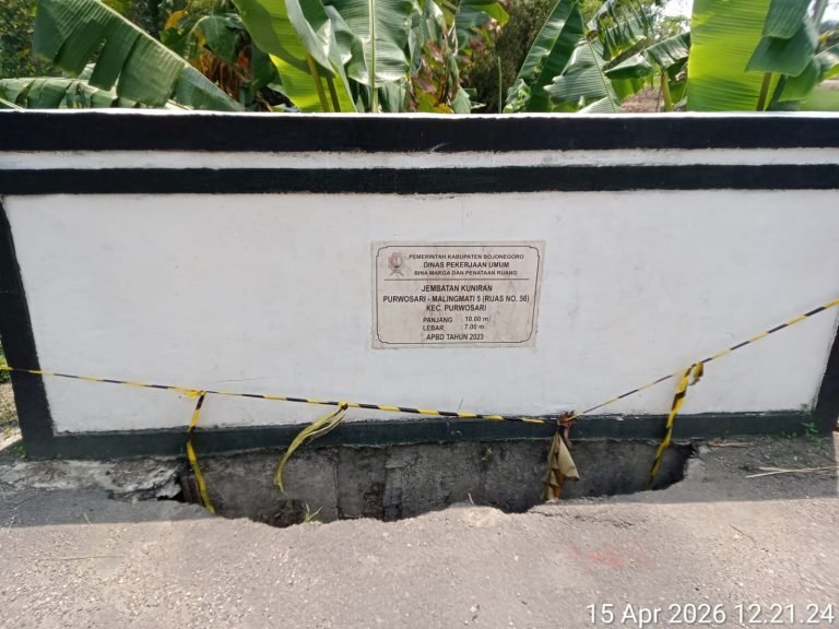 BOJONEGORO | Beritakilat.id – Kondisi yang sangat memprihatinkan terlihat pada jembatan penghubung di Desa Kuniran, Kecamatan Purwosari, Kabupaten Bojonegoro. Rabu. 15/04/2026