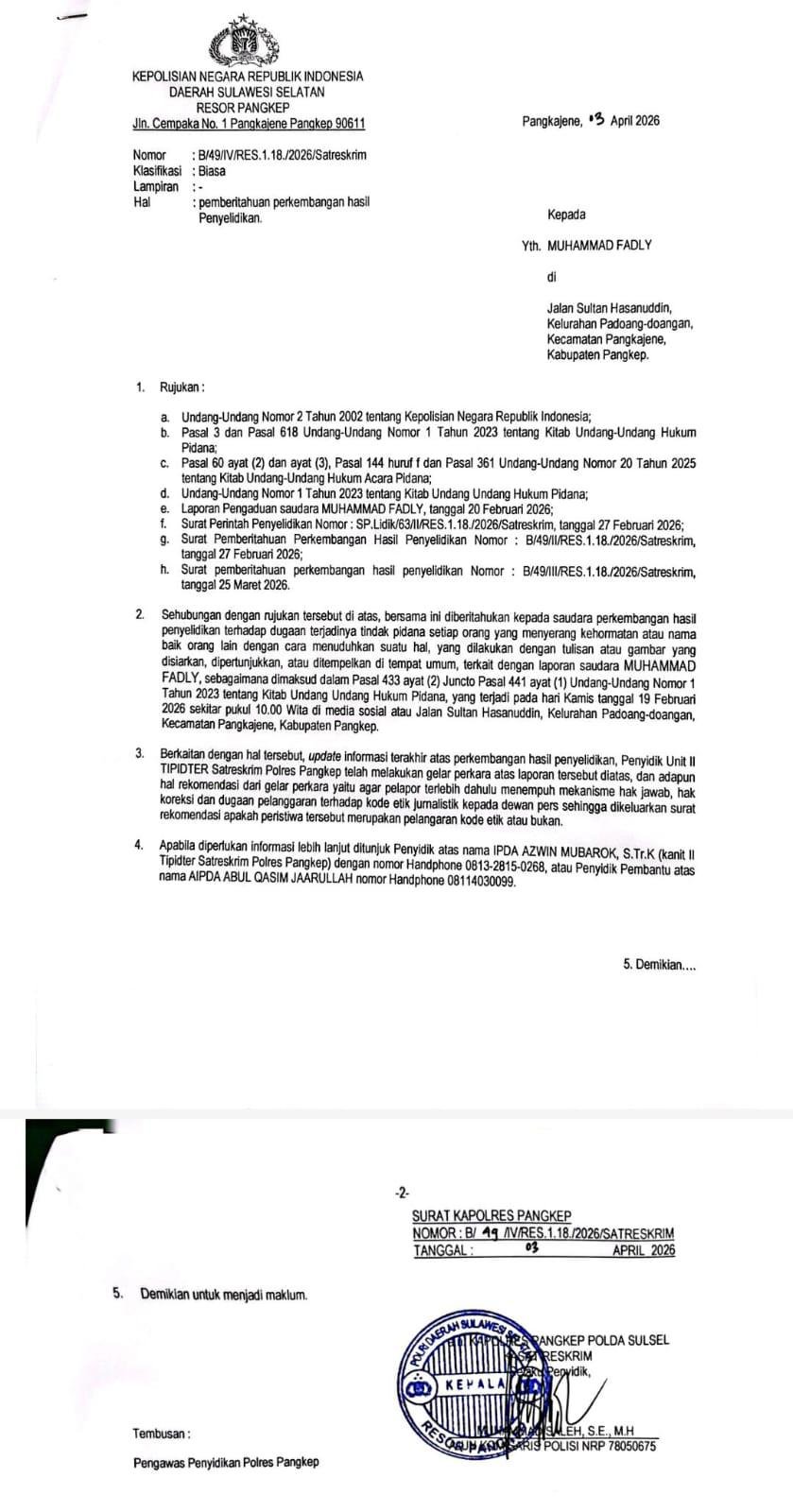 Sehingga, berdasarkan hasil kajian yang dilakukan, pihak Polres Pangkep merekomendasikan kepada pelapor Muhammad Fadly agar menempuh jalur yang tepat, yaitu melalui Dewan Pers, sebagai lembaga yang berwenang menangani persoalan etik jurnalistik.