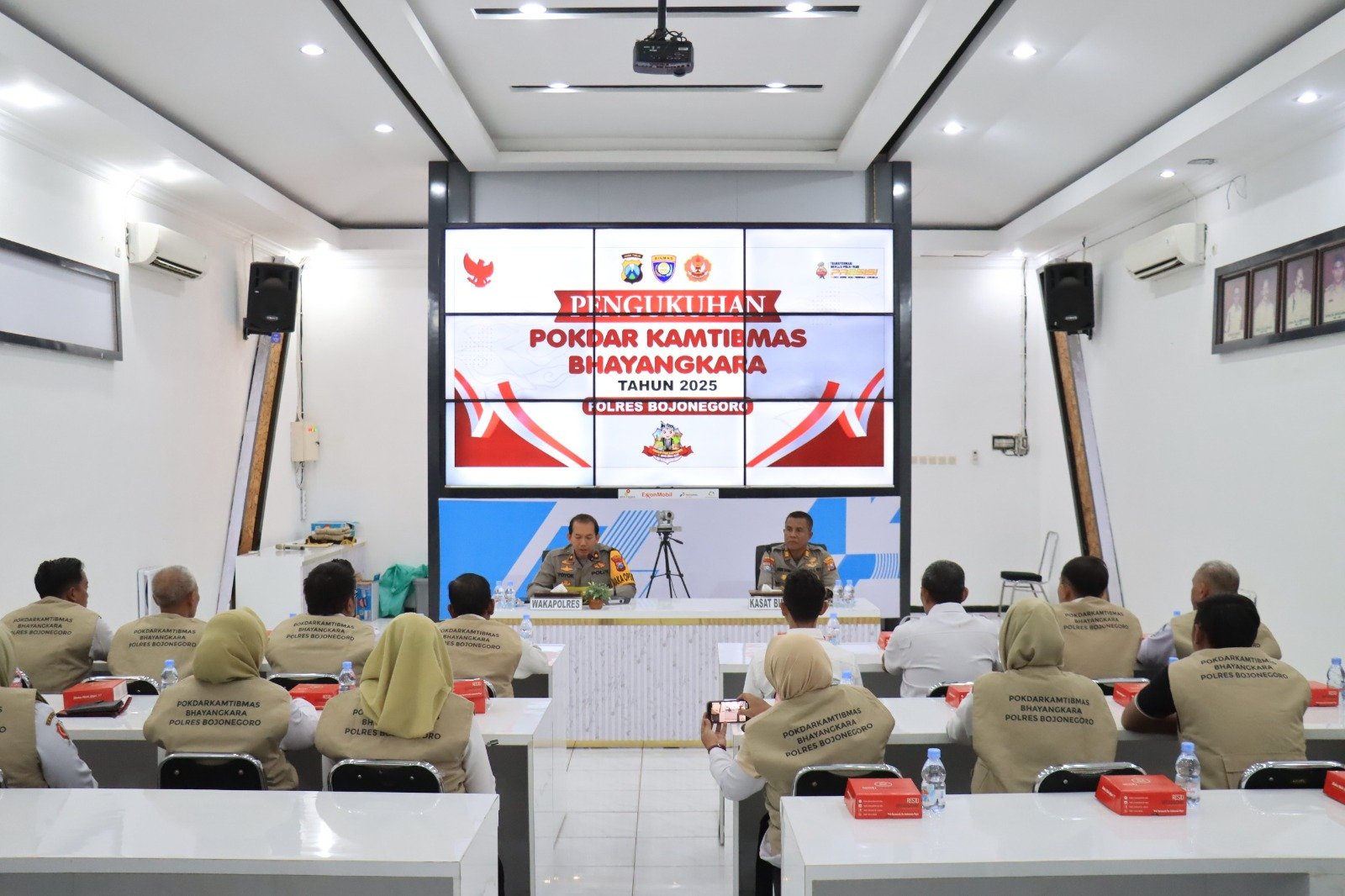 BOJONEGORO I Beritakilat.id – Polres Bojonegoro melalui Satuan Pembinaan Masyarakat (Sat Binmas) resmi mengukuhkan kepengurusan nasional Kelompok Sadar Keamanan dan Ketertiban Masyarakat Bhayangkara (Pokdar Kamtibmas Bhayangkara) masa bakti 2025–2029. Pengukuhan tersebut berlangsung di Gedung AP I Rawi Polres Bojonegoro, Rabu (26/11/2025).