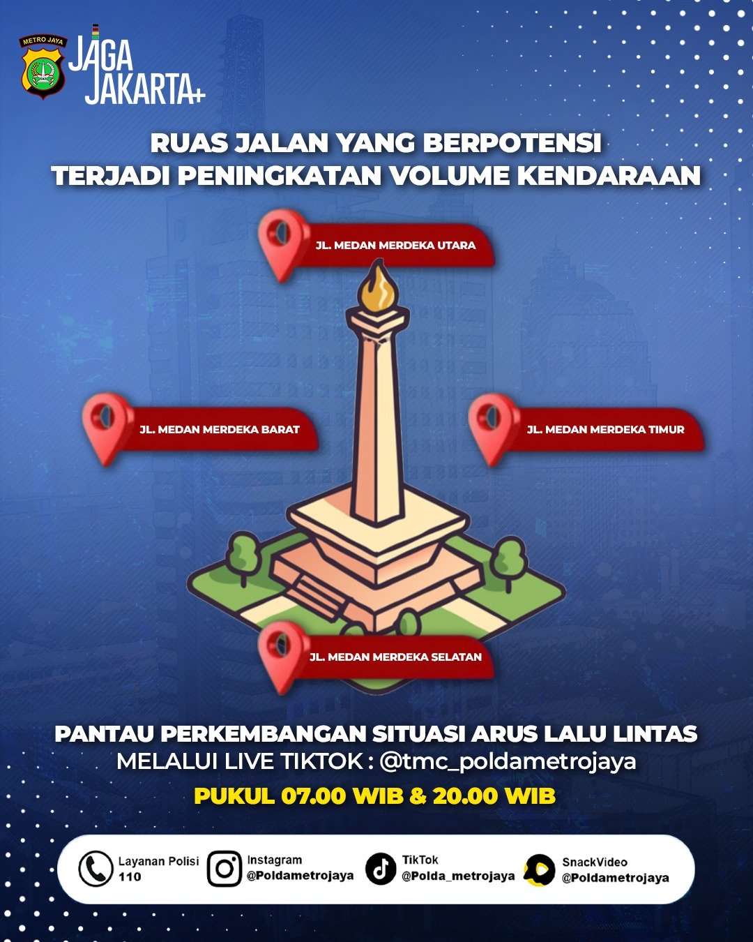 Adapun titik-titik yang berpotensi mengalami kepadatan antara lain Jalan Medan Merdeka Barat, Jalan Merdeka Selatan, Jalan Merdeka Timur, serta Jalan Medan Merdeka Utara.