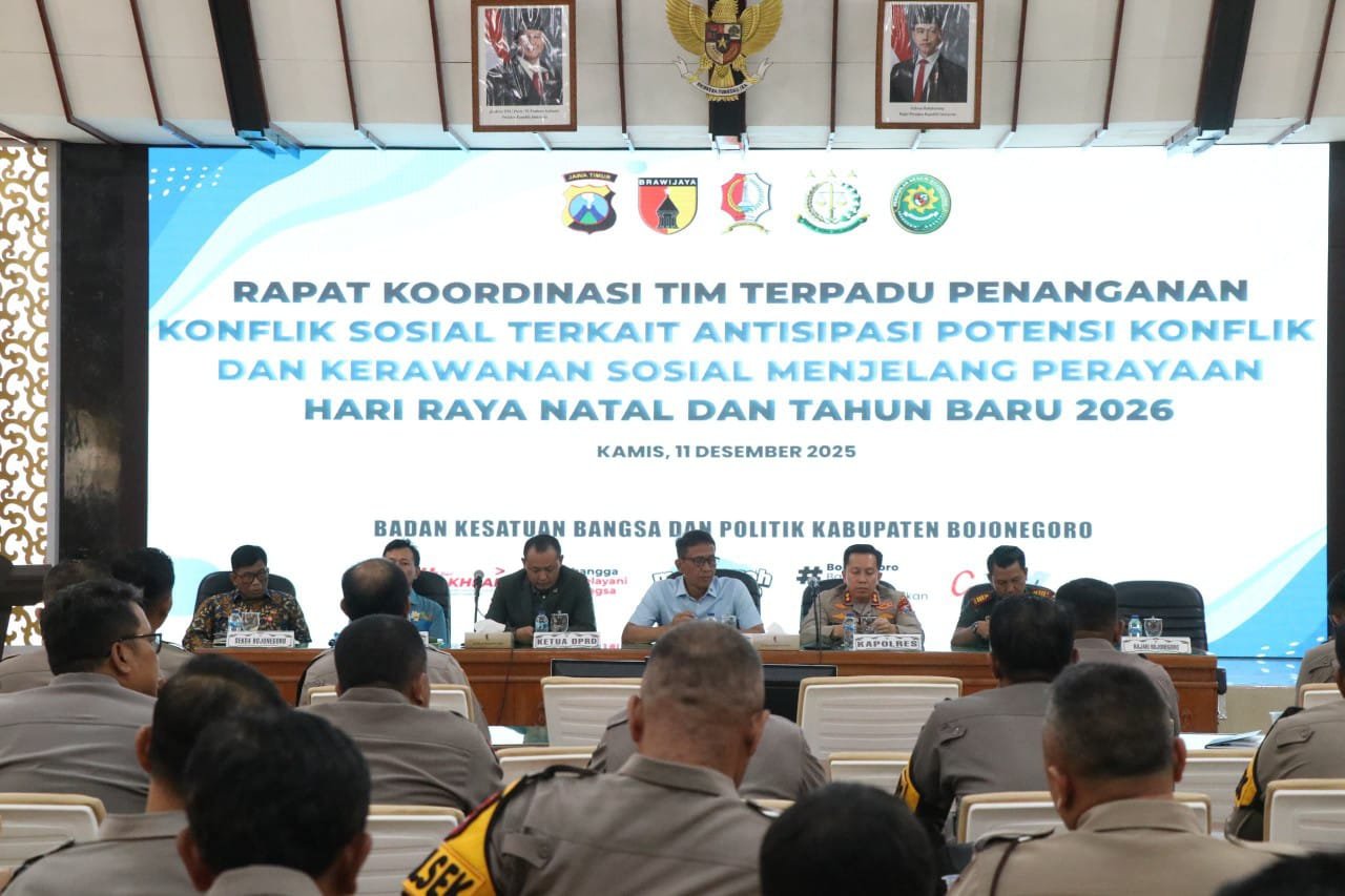 BOJONEGORO I Beritakilat.id –  Pemerintah Kabupaten Bojonegoro menggelar Rapat Koordinasi Tim Terpadu Penanganan Konflik Sosial dalam rangka mengantisipasi potensi konflik dan kerawanan sosial menjelang perayaan Natal dan Tahun Baru 2026. Acara yang berlangsung di Ruang Angling Dharmo (11/12) ini menghadirkan jajaran Forkopimda sebagai narasumber, meliputi Bupati Bojonegoro, Ketua DPRD Kabupaten Bojonegoro, Kapolres Bojonegoro, perwakilan Kodim 0813, Sekretaris Daerah Kabupaten Bojonegoro, serta Kepala BPBD Kabupaten Bojonegoro.
