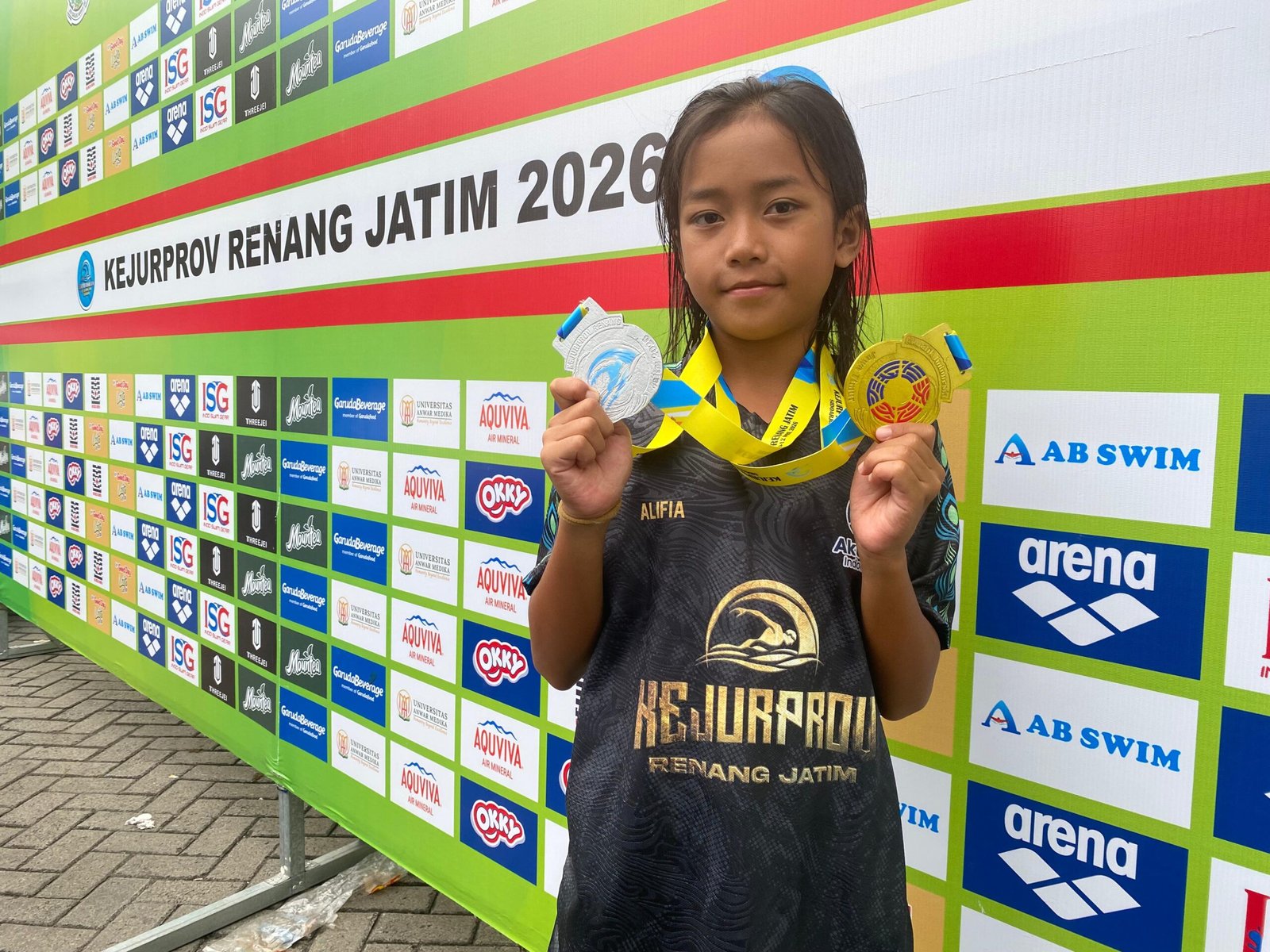 SIDOARJO l Beritakilat.id – Atlet renang muda asal Ponorogo, Aliffia Ratu Askha, berhasil mencatatkan prestasi membanggakan dalam ajang Kejuaraan Provinsi (Kejurprov) Renang Jawa Timur 2026 yang digelar di Kolam Renang Delta Sidoarjo, Minggu (12/4/2026).
