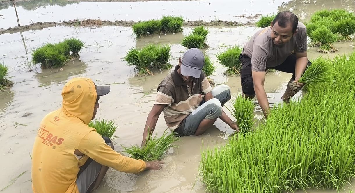 Kegiatan yang menunjukkan sinergi dan kemitraan erat antara Polri dan masyarakat petani ini berlangsung pada hari Selasa (2/12/2025), dimulai pukul 08.30 WIB. Kanit Binmas Polsek Bogorejo Aiptu Pujiranto dan Bhabinkamtibmas Desa Prantaan Aipda Arip Nirwanto, S.H., tak canggung “nyemplung” ke sawah, membantu para petani yang sedang mempersiapkan bibit untuk ditanam.